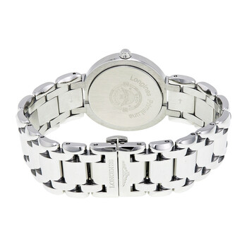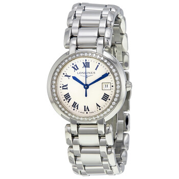 Stainless steel case with a stainless steel bracelet. Fixed stainless steel diamond-set bezel. Silver dial with blue hands and Roman numeral hour markers. Minute markers around the outer rim. Dial Type: Analog. Date display at the 3 o'clock position. Longines calibre L129 quartz movement. Scratch resistant sapphire crystal. Pull / push crown. Solid case back. Case size: 30 mm. Round case shape. Hidden fold over clasp. Water resistant at 30 meters / 100 feet. Functions: date, hour, minute, second. Additional Info: The bezel is set with 48 diamonds (0.403 ct.). Luxury watch style. Watch label: Swiss Made. Item Variations: L8 112 0 71 6, L8-112-0-71-6, L8/112/0/71/6, L81120716. Longines Prima Luna Silver Dial Diamond Ladies Watch L8.112.0.71.6.