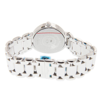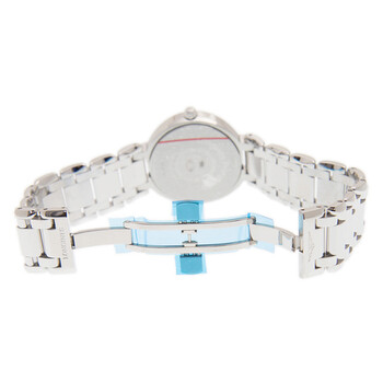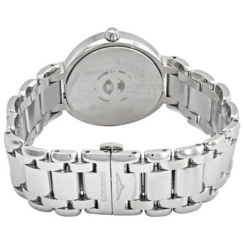 Stainless steel case with a stainless steel bracelet. Fixed stainless steel bezel. Silver dial with blue hands and Roman numeral hour markers. Minute markers around the outer rim. Dial Type: Analog. Date display at the 3 o'clock position. Moon phase display. Longines calibre L296 quartz movement. Scratch resistant sapphire crystal. Pull / push crown. Solid case back. Round case shape. Case size: 34 mm. Case thickness: 10.2 mm. Butterfly clasp. Water resistant at 30 meters / 100 feet. Functions: moon phase, date, hour, minute, second. Dress watch style. Watch label: Swiss Made. Longines PrimaLuna Quartz Silver Dial Ladies Watch L8.116.4.71.6.