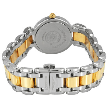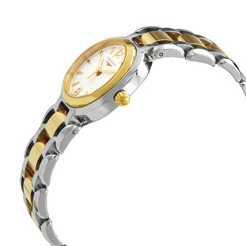 Stainless steel case with a two-tone (silver-tone and 18kt yellow gold-capped) stainless steel bracelet. Fixed silver-tone and 18kt yellow gold-capped bezel. White dial with yellow gold-tone hands and index hour markers. Arabic numerals appear at the 6 and 12 o'clock positions. Minute markers around the outer rim. Dial Type: Analog. Date display at the 3 o'clock position. Quartz movement. Scratch resistant sapphire crystal. Pull / push crown. Solid case back. Round case shape. Case size: 26.5 mm. Deployment clasp. Water resistant at 30 meters / 100 feet. Functions: date, hour, minute, second. Primaluna Series. Dress watch style. Watch label: Swiss Made. Longines PrimaLuna Quartz White Dial Ladies Watch L8.110.5.90.6.