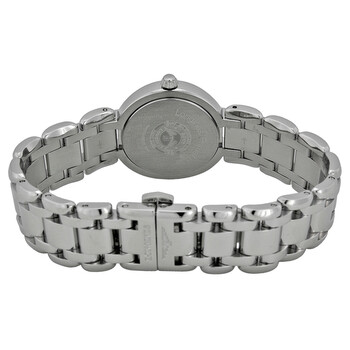 Stainless steel case with a stainless steel bracelet. Fixed stainless steel bezel. Silver dial with blue steel hands and Roman numeral hour markers. Minute markers around the outer rim. Dial Type: Analog. Date display at the 3 o'clock position. Quartz movement. Scratch resistant sapphire crystal. Push / pull crown. Solid case back. Case diameter: 26.5 mm. Case thickness: 8 mm. Round case shape. Bracelet width: 16 mm. Band length: 6 inches. Deployment clasp with a push button release. Water resistant at 30 meters / 100 feet. Functions: date, hour, minute, second. Casual watch style. Longines PrimaLuna Silver Dial Stainless Steel Ladies Watch L81104716.