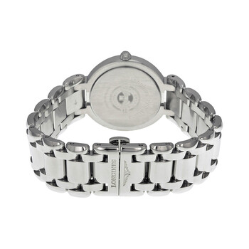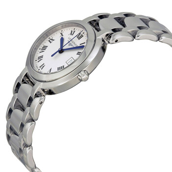 Stainless steel case with a stainless steel bracelet. Fixed stainless steel bezel. Silver dial with blue steel hands and Roman numeral hour markers. Minute markers around the outer rim. Date display appears at the 3 o'clock position. Quartz movement. Scratch resistant sapphire crystal. Solid case back. Case diameter: 30 mm. Hidden folding clasp. Water resistant at 30 meters/ 100 feet. Functions: hours, minutes, seconds, calendar. Longines PrimaLuna Stainless Steel Ladies Watch L8.112.4.71.6.