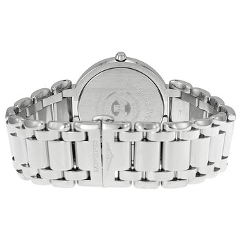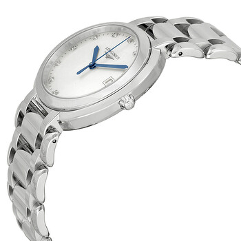 Silver-tone stainless steel case with a silver-tone stainless steel bracelet. Fixed silver-tone 44 diamond set bezel. White dial with blue sword-shaped hands and index hour markers. Arabic numerals mark the 6 and 12 o'clock positions. minute markers around the outer rim. Dial Type: Analog. Date display at the 3 o'clock position. Longines Calibre L263 quartz movement. Scratch resistant sapphire crystal. Pull / push crown. Solid case back. Round case shape, case size: 26.5 mm. Hidden fold over clasp. Water resistant at 30 meters / 100 feet. Functions: date, hour, minute, second, battery eol indicator. Primaluna Series. Dress watch style. Watch label: Swiss Made. Item Variations: L8 114 4 87 6, L8-114-4-87-6, L8/114/4/87/6, L81144876. Longines Primaluna White Dial Diamond Stainless Steel Ladies Watch L81144876.