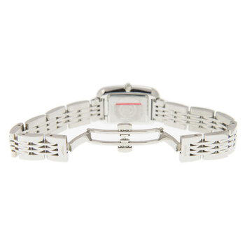 Silver-tone stainless steel case and bracelet. Fixed bezel. Mother of pearl dial with blue hands and diamond hour markers. Dial Type: Analog. One subdial displaying: one- small seconds. Longines Calibre L178 quartz movement. Scratch resistant sapphire crystal. Pull / push crown. Solid case back. Square case shape, case size: 32 mm x 22 mm. Water resistant at 30 meters / 100 feet. Functions: hour, minute, second. Casual watch style. Watch label: Swiss Made. Longines Quartz Diamond Ladies Watch L6.141.4.87.6.