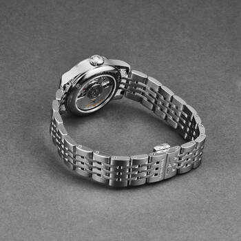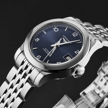 Silver-tone stainless steel case and bracelet. Fixed silver-tone bezel. Blue dial with silver-tone hands and Arabic numeral, index hour markers. Dial Type: Analog. Date display at the 3 o'clock position. Longines Calibre L592.4 Automatic movement, based upon ETA A20.L11, containing 22 Jewels, bitting at 28800 vph, and has a power reserve of approximately 40 hours. Scratch resistant sapphire crystal. Transparent see through case back. Round case shape, case size: 26 mm. Deployment clasp. Water resistant at 30 meters / 100 feet. Functions: date, hour, minute, second. Record Series. Watch label: Swiss Made. Longines Record Automatic Blue Dial Ladies Watch L23204966.