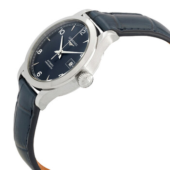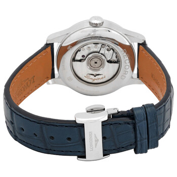 Silver-tone stainless steel case with a blue alligator/crocodile leather strap. Fixed stainless steel bezel. Blue dial with silver-tone hands and index-Arabic numerals hour markers. Dial Type: Analog. Date display at the 3 o'clock position. Caliber L592.4 (ETA A20.L11) beats at 28'800 vph automatic movement. Scratch resistant sapphire crystal. Pull / push crown. Transparent case back. Round case shape, case size: 30 mm. Push button deployant buckle clasp. Water resistant at 30 meters / 99 feet. Functions: date, hour, minute, second. Record Series. Dress watch style. Watch label: Swiss Made. Longines Record Automatic Blue Dial Ladies Watch L23214964.