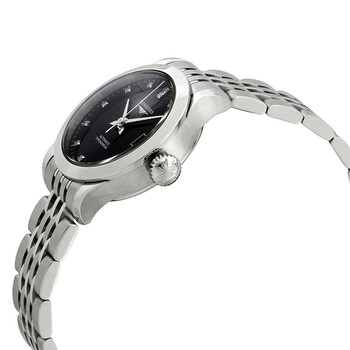 Silver-tone stainless steel case with a silver-tone stainless steel bracelet. Fixed silver-tone stainless steel bezel. Black dial with silver-tone hands and diamond hour markers. Minute markers around the outer rim. Dial Type: Analog. Date display at the 3 o'clock position. Longines Calibre L592.4 automatic movement with a 40-hour power reserve. Scratch resistant sapphire crystal. Pull / push crown. Transparent case back. Round case shape. Case size: 26 mm. Band width: 13 mm. Triple fold over with safety release clasp. Water resistant at 30 meters / 100 feet. Functions: date, hour, minute, second, chronometer. Additional Info: dial set with 12 top wesselton vs-si diamonds, 0.034 cts. Luxury watch style. Watch label: Swiss Made. Item Variations: L23204576. Longines Record Automatic Chronometer Diamond Black Dial Ladies Watch L2.320.4.57.6.