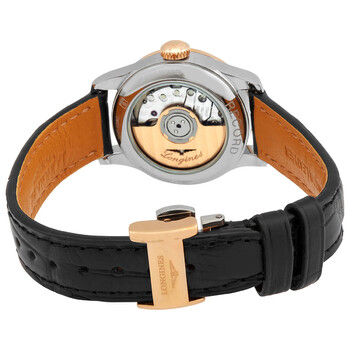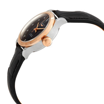 Silver-tone stainless steel case with a black alligator leather strap. Fixed rose gold-tone stainless steel bezel. Black dial with rose gold-tone hands and diamond hour markers. Minute markers around the outer rim. Dial Type: Analog. Date display at the 3 o'clock position. Automatic movement. Scratch resistant sapphire crystal. Transparent case back. Round case shape, case size: 26 mm. Tang clasp. Water resistant at 30 meters / 100 feet. Functions: date, hour, minute, second, chronometer. Record Series. Luxury watch style. Watch label: Swiss Made. Longines Record Automatic Chronometer Diamond Black Dial Ladies Watch L23205572.