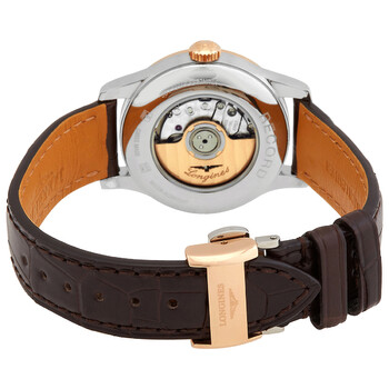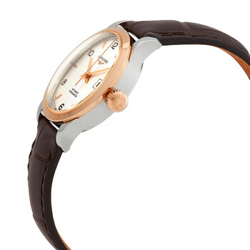 Silver-tone stainless steel case with a brown alligator leather strap. Fixed 18kt rose gold (capped) stainless steel bezel. Silver dial with rose gold-tone hands and alternating Arabic numeral and index hour markers. Minute markers around the outer rim. Dial Type: Analog. Date display at the 3 o'clock position. Longines Calibre L592.4 Automatic movement, based upon ETA A20.L11, containing 22 Jewels, bitting at 28800 vph, and has a power reserve of approximately 40 hours. Scratch resistant sapphire crystal. Pull / push crown. Transparent case back. Round case shape, case size: 30 mm, case thickness: 10.7 mm. Band width: 15 mm. Folding clasp. Water resistant at 30 meters / 100 feet. Functions: date, hour, minute, second, chronometer. Record Series. Dress watch style. Watch label: Swiss Made. Longines Record Automatic Chronometer Silver Dial Ladies Watch L2.321.5.76.2.