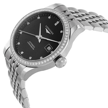 Stainless steel case with a brushed & polished stainless steel bracelet. Fixed stainless steel bezel. Black dial with silver-tone hands and diamond hour markers. Dial Type: Analog. Date display at the 3 o'clock position. ETA Caliber L592.4 ( A20.L11) beats at 28'800 vph automatic movement. Scratch resistant sapphire crystal. Pull / push crown. Transparent case back. Round case shape, case size: 30 mm. Push button folding clasp. Water resistant at 30 meters / 99 feet. Functions: date, hour, minute, second. Record Series. Dress watch style. Watch label: Swiss Made. Longines Record Automatic Diamond Black Dial Ladies Watch L23210576.