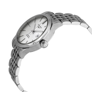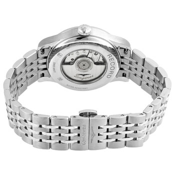 Stainless steel case with stainless steel bracelet. Fixed stainless steel bezel. Silver sunray dial with silver-tone hands and index hour markers. Minute markers around the outer rim. Dial Type: Analog. Date display at the 3 o'clock position. Longines calibre L592.4 automatic movement, based upon ETA A20.L11, containing 22 Jewels, bitting at 28800 vph, and has a power reserve of approximately 40 hours. Scratch resistant sapphire crystal. Pull / push crown. Transparent case back. Round case shape. Case size: 30 mm. Case thickness: 9 mm. Band width: 15 mm. Fold over clasp with a push button release. Water resistant at 30 meters / 100 feet. Functions: date, hour, minute, second. Record Series. Casual watch style. Watch label: Swiss Made. Longines Record Automatic Silver Dial Ladies Watch L2.321.4.72.6.