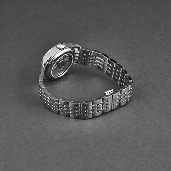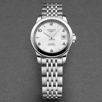 Silver-tone stainless steel case and bracelet. Silver-tone bezel. Silver dial with silver-tone hands and Arabic numeral, index hour markers. Dial Type: Analog. Date display at the 3 o'clock position. Longines Calibre L592.4 Automatic movement, based upon ETA A20.L11, containing 22 Jewels, bitting at 28800 vph, and has a power reserve of approximately 40 hours. Scratch resistant sapphire crystal. Transparent see through case back. Round case shape, case size: 26 mm. Deployment clasp. Water resistant at 30 meters / 100 feet. Functions: date, hour, minute, second. Record Series. Watch label: Swiss Made. Longines Record Automatic Silver Dial Ladies Watch L23204766.