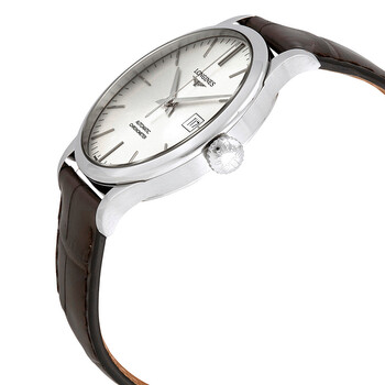 Stainless steel case with a brown (alligator) leather strap. Fixed stainless steel bezel. Sunray silver dial with silver-tone hands and index hour markers. Minute markers around the outer rim. Dial Type: Analog. Date display at the 3 o'clock position. Longines calibre L888.4 automatic movement, based upon ETA A31.L11, containing 21 Jewels, bitting at 25200 vph, and has a power reserve of approximately 64 hours. Scratch resistant sapphire crystal. Transparent case back. Round case shape. Case size: 40 mm. Band width: 20 mm. Fold over clasp with a safety release. Water resistant at 30 meters / 100 feet. Functions: date, hour, minute, second. Casual watch style. Watch label: Swiss Made. Longines Record Automatic Sunray Silver Dial Men's Watch L28214722.