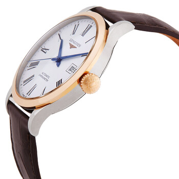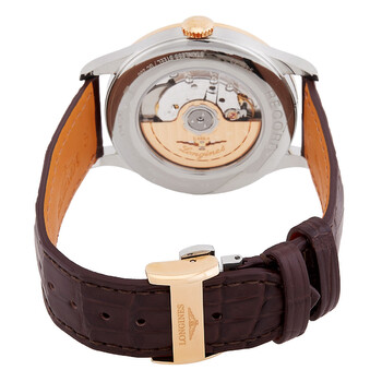 Silver-tone stainless steel case with a brown alligator band. Fixed rose gold-tone 18kt rose gold bezel. White dial with blue hands and Roman numeral hour markers. Minute markers around the outer rim. Dial Type: Analog. Date display at the 3 o'clock position. Automatic movement. Scratch resistant sapphire crystal. Screw down crown. Transparent see through case back. Round case shape, case size: 40 mm. Water resistant at 30 meters / 100 feet. Functions: date, hour, minute, second. Additional Info: original box, international warranty card, manual (complete accessories). Record Series. Luxury watch style. Watch label: Swiss Made. Longines Record Automatic White Dial Men's Watch L2.821.5.11.2.