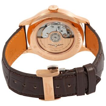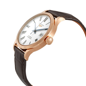 18kt rose gold case with a brown (alligator) leather strap. Fixed 18kt rose gold bezel. White matt dial with blue steel hands and Roman numeral hour markers. Minute markers around the outer rim. Dial Type: Analog. Date display at the 3 o'clock position. Longines calibre L888.4 automatic movement, based upon ETA A31.L11, containing 21 Jewels, bitting at 25200 vph, and has a power reserve of approximately 64 hours. Scratch resistant sapphire crystal. Pull / push crown. Transparent case back. Round case shape. Case size: 38.50 mm. Case thickness: 10.7 mm. Band width: 19 mm. Triple safety fold over clasp. Water resistant at 30 meters / 100 feet. Functions: date, hour, minute, second, chronometer. Record Series. Luxury watch style. Watch label: Swiss Made. Longines Record Automatic White Matt Dial Unisex Watch L2.820.8.11.2.