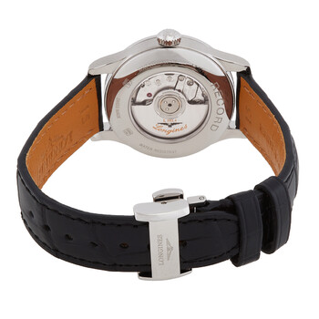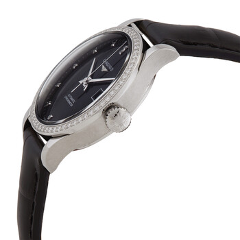 Silver-tone stainless steel case with a black leather strap. Fixed silver-tone bezel with diamond set. Black dial with silver-tone hands and diamond hour markers. Dial Type: Analog. Date display at the 3 o'clock position. Longines Calibre L592.4 Automatic movement, based upon ETA A20.L11, containing 22 Jewels, bitting at 28800 vph, and has a power reserve of approximately 40 hours. Scratch resistant sapphire crystal. Pull / push crown. Transparent case back. Round case shape, case size: 30 mm, case thickness: 10.7 mm. Band width: 15 mm, band length: 7 inches. Deployment with push button release clasp. Water resistant at 30 meters / 100 feet. Functions: date, hour, minute, second. Additional Info: hours, minutes, seconds and date. Record Series. Dress watch style. Watch label: Swiss Made. Longines Record Diamond Black Dial Ladies Watch L23210572.