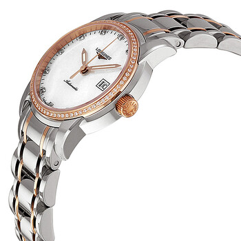 Stainless steel case with a stainless steel and 18kt rose gold bracelet. Fixed 18kt rose gold set with diamonds bezel. Mother of pearl dial with rose gold-tone hands and diamond hour markers. Minute markers around the outer rim. Dial Type: Analog. Luminescent hands. Date display at the 3 o'clock position. Longines Calibre L595 automatic movement with about 40 hours power reserve. Scratch resistant sapphire crystal. Pull / push crown. Skeleton case back. Case size: 30 mm. Round case shape. Deployment with push button clasp. Water resistant at 30 meters / 100 feet. Functions: date, hour, minute, second. Luxury watch style. Watch label: Swiss Made. Item Variations: L25635877. Longines Saint Imier Automatic Diamond Rose Gold and Steel Ladies Watch L25635877.