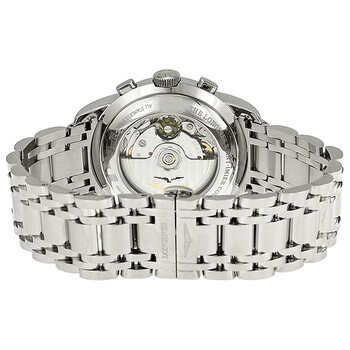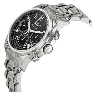 Stainless steel case with a stainless steel bracelet. Fixed stainless steel bezel. Black dial with silver-tone hands and Arabic numeral hour markers. Minute markers around the outer rim. Dial Type: Analog. Luminescent hands and markers. Date display between 4 and 5 o'clock positions. Chronograph - three sub-dials displaying: 60 second, 30 minute and 12 hour. Automatic movement with 54 hour power reserve. Scratch resistant sapphire crystal. Case diameter: 41 mm. Round case shape. Deployment clasp with push button. Water resistant at 30 meters / 100 feet. Functions: chronograph, date, hour, minute, second. Dress watch style. Watch label: Swiss Made. Longines Saint Imier Chronograph Black Dial Stainless Steel Men's Watch L27524536.