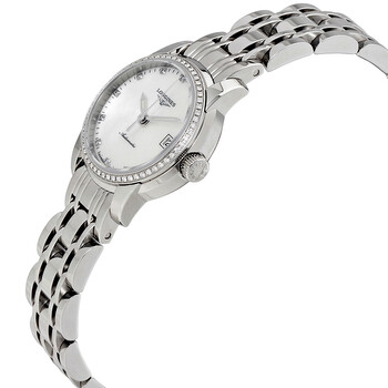 Stainless steel case with a stainless steel bracelet. Fixed stainless steel bezel. Mother of pearl dial with luminous silver-tone hands and diamond hour markers. Minute markers around the outer rim. Dial Type: Analog. Date display at the 3 o'clock position. Longines calibre L595 automatic movement, based upon ETA 2000/1, containing 20 Jewels, bitting at 28800 vph, and has a power reserve of approximately 40 hours. Scratch resistant sapphire crystal. Pull / push crown. Solid case back. Round case shape. Case size: 26 mm. Case thickness: 9 mm. Band width: 13 mm. Fold over clasp with a push button release. Water resistant at 30 meters / 100 feet. Functions: date, hour, minute, second. Saint-imier Collection Series. Dress watch style. Watch label: Swiss Made. Longines Saint-Imier Automatic Mother of Pearl Dial Ladies Watch L22630876.