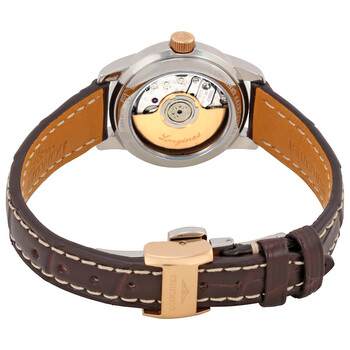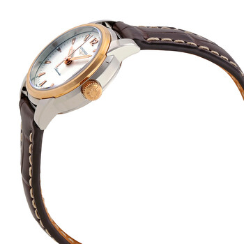 Silver-tone stainless steel case with a brown leather strap. Fixed rose gold PVD bezel. Silver dial with luminous rose gold-tone hands and index hour markers. An Arabic numeral appear at the 12 o'clock position. Minute markers around the outer rim. Dial Type: Analog. Luminescent hands and markers. Date display at the 3 o'clock position. Longines Calibre L595 automatic movement with a 42-hour power reserve. Scratch resistant sapphire crystal. Transparent case back. Case size: 26 mm. Round case shape. Deployment clasp. Water resistant at 30 meters / 100 feet. Functions: date, hour, minute, second. Luxury watch style. Watch label: Swiss Made. Longines Saint-Imier Automatic Silver Dial Ladies Watch L2.263.5.72.0.