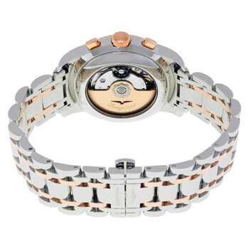 Stainless steel case with a stainless steel bracelet with 18kt rose gold links. Fixed 18kt rose gold bezel. Black dial with luminous rose gold-tone hands and index hour markers. An arabic numeral appears at the 12 o'clock position. Minute markers around the outer rim. Dial Type: Analog. Luminescent hands. Date display between the 4 and 5 o'clock positions. Chronograph - three sub-dials displaying: 60 seconds, 30 minutes, and 12 hours. Longines calibre L688 automatic movement with a 54-hour power reserve. Scratch resistant sapphire crystal. Pull / push crown. Transparent case back. Case size: 39 mm. Round case shape. Band width: 20 mm. Deployment clasp with a push button release. Water resistant at 30 meters / 100 feet. Functions: chronograph, date, hour, minute, second. Luxury watch style. Watch label: Swiss Made. Longines Saint-Imier Black Chronograph Dial Automatic Men's Watch L2.753.5.52.7.