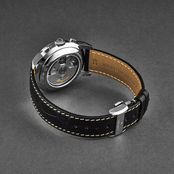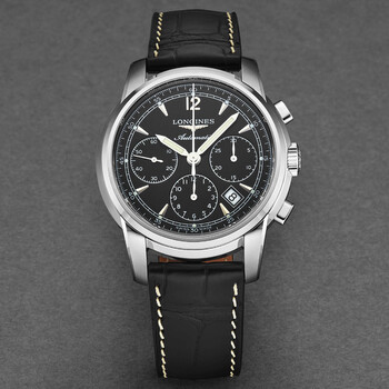 Silver-tone stainless steel case with a black leather strap. Fixed silver-tone bezel. Black dial with silver-tone hands and Arabic numeral and index hour markers. Minute markers around the outer rim. Dial Type: Analog. Luminescent hands and markers. Date display between 4 and 5 o'clock position. Chronograph - three sub-dials displaying: 60 seconds, 30 minutes, and 12 hours. Longines Calibre L688 automatic movement with a 54-hour power reserve. Scratch resistant sapphire crystal. Transparent case back. Case size: 41 mm. Round case shape. Buckle clasp. Water resistant at 30 meters / 100 feet. Functions: chronograph, column wheel, date, hour, minute, small second. Casual watch style. Watch label: Swiss Made. Item Variations: L2 752 4 52 4, L2-752-4-52-4, L2/752/4/52/4, L27524524. Longines Saint-Imier Chronograph Automatic Men's Watch L2.752.4.52.4.