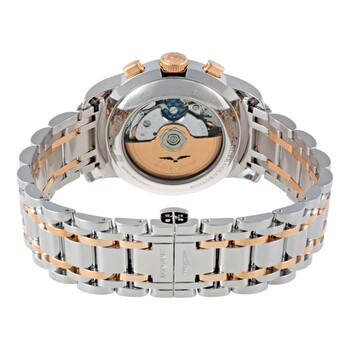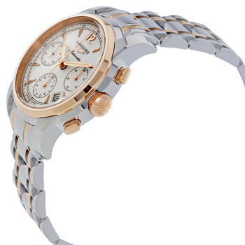 Stainless steel case with a stainless steel bracelet with 18kt rose gold links. Fixed 18kt rose gold bezel. Silver dial with rose gold-tone hands and index hour markers. An Arabic numeral appears at the 12 o'clock position. Minute markers around the outer rim. Dial Type: Analog. Luminescent hands. Date display between the 4 and 5 o'clock positions. Chronograph - three sub-dials displaying: 60 seconds, 30 minutes, and 12 hours. Longines calibre L688 automatic movement with a 54-hour power reserve. Scratch resistant sapphire crystal. Pull / push crown. Transparent case back. Case size: 39 mm. Case thickness: 14 mm. Round case shape. Deployment clasp. Water resistant at 30 meters / 100 feet. Functions: chronograph, date, hour, minute, second. Luxury watch style. Watch label: Swiss Made. Longines Saint-Imier Chronograph Automatic Men's Watch L27535727.