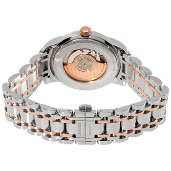 Stainless steel case with a stainless steel bracelet with 18kt rose gold links. Fixed 18kt rose gold bezel. Black dial with luminous rose gold hands and index hour markers. An Arabic numeral appears at the 1 2 o'clock position. Minute markers around the outer rim. Dial Type: Analog. Luminescent hands and markers. Date display at the 3 o'clock position. Longines calibre L619 automatic movement, based upon ETA 2892-A2, containing 21 Jewels, bitting at 28800 vph, and has a power reserve of approximately 42 hours. Scratch resistant sapphire crystal. Pull / push crown. Transparent case back. Round case shape. Case size: 38.5 mm. Case thickness: 10.6 mm. Fold over clasp with a push button release. Water resistant at 30 meters / 100 feet. Functions: date, hour, minute, second. Saint-imier Collection Series. Dress watch style. Watch label: Swiss Made. Item Variations: L27635527. Longines Saint-Imier Collection Automatic Black Dial Men's Watch L2.763.5.52.7.
