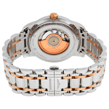 Stainless steel case with a stainless steel bracelet with 18kt rose gold (cap) links. Fixed 18kt rose gold (cap) bezel. Silver dial with luminous gold-tone hands and index hour markers. An Arabic numeral appears at the 12 o'clock position. Arabic numeral minute markers (at 5 minute intervals). Minute markers around the outer rim. Dial Type: Analog. Luminescent hands and markers. Date display at the 3 o'clock position. Longines calibre L619 automatic movement, based upon ETA 2892-A2, containing 21 Jewels, bitting at 28800 vph, and has a power reserve of approximately 42 hours. Scratch resistant sapphire crystal. Transparent case back. Round case shape. Case size: 41 mm. Case thickness: 14 mm. Band width: 22 mm. Fold over clasp. Water resistant at 30 meters / 100 feet. Functions: date, hour, minute, second. Saint-imier Collection Series. Casual watch style. Watch label: Swiss Made. Longines Saint-Imier Collection Automatic Men's Watch L2.766.5.79.7.