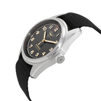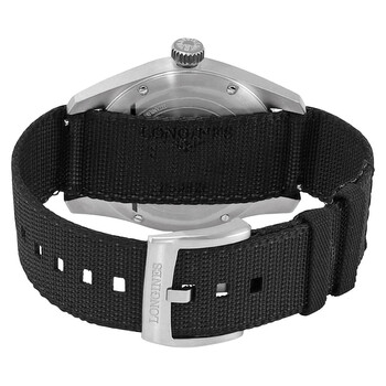 Grey titanium case with a black nylon strap. Fixed grey titanium bezel. Black anthracite dial with luminous gold-tone hands and Arabic numeral hour markers. Arabic numeral minute markers (at 5 minute intervals). Minute markers around the outer rim. Dial Type: Analog. Luminescent hands and markers. Longines calibre L888.4 automatic movement, based upon ETA A31.L11, containing 21 Jewels, bitting at 25200 vph, and has a power reserve of approximately 64 hours. Scratch resistant sapphire crystal. Screw down crown. Solid case back. Round case shape. Case size: 40 mm. Case thickness: 12.2 mm. Band width: 21 mm. Tang clasp. Water resistant at 100 meters / 330 feet. Functions: hour, minute, second. Additional Info: original box, manual (complete accessories). Spirit Series. Luxury watch style. Watch label: Swiss Made. Longines Spirit Automatic Black Dial Men's Watch L3.810.1.53.2.