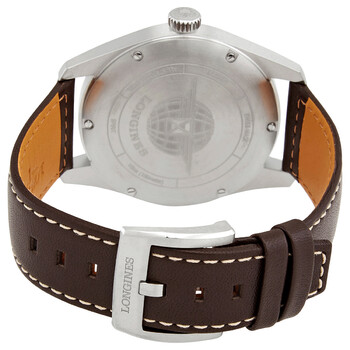 Stainless steel case with a brown (calfskin) leather strap. Fixed stainless steel bezel. Black dial with silver-tone hands and Arabic numeral hour markers. Arabic numeral minute markers (at 5 minute intervals). Minute markers around the outer rim. Dial Type: Analog. Luminescent hands and markers. Date display at the 3 o'clock position. Longines calibre L888 automatic movement, based upon ETA A31.L11, containing 21 Jewels, bitting at 25200 vph, and has a power reserve of approximately 64 hours. Anti-reflective scratch resistant sapphire crystal. Screw down crown. Solid case back. Round case shape. Case size: 42 mm. Case thickness: 12.2 mm. Band width: 22 mm. Tang clasp. Water resistant at 100 meters. Functions: date, hour, minute, second. Spirit Series. Dress watch style. Watch label: Swiss Made. Longines Spirit Automatic Black Dial Men's Watch L3.811.4.53.0.