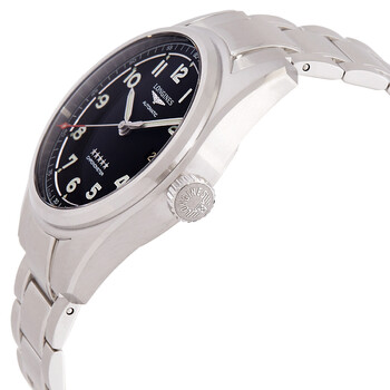 Stainless steel case with a silver-tone stainless steel bracelet. Fixed stainless steel bezel. Matte black dial with Arabic numeral hour markers. Minute markers around the outer rim. Dial Type: Analog. Luminescent hands and markers. Date display at the 3 o'clock position. Longines Calibre L888.4 Automatic movement, based upon ETA A31.L11, containing 21 Jewels, bitting at 25200 vph, and has a power reserve of approximately 64 hours. Scratch resistant sapphire crystal. Solid case back. Round case shape, case size: 40 mm. Deployment with push button release clasp. Water resistant at 100 meters / 330 feet. Functions: hour, minute, second. Spirit Series. Luxury watch style. Watch label: Swiss Made. Longines Spirit Automatic Men's Watch L3.810.4.53.6.