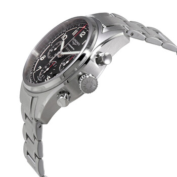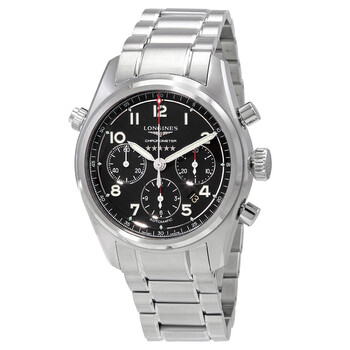 Stainless steel case with a stainless steel bracelet. Fixed stainless steel bezel. Black dial with luminous silver-tone hands and Arabic numeral hour markers. Arabic numeral minute markers (at 5 minute intervals). Minute markers around the outer rim. Luminescent hands and markers. Date display between the 4 and 5 o'clock positions. Chronograph - three sub-dials displaying: 60 second, 30 minute and 12 hours. Caliber L688.4 automatic movement. Anti-reflective scratch resistant sapphire crystal. Screw down crown. Solid case back. Round case shape. Case size: 42 mm. Case thickness: 16.3 mm. Band width: 22 mm. Fold over clasp with a push button release. Water resistant at 100 meters. Functions: chronograph, date, hour, minute, second. Spirit Series. Casual watch style. Longines Spirit Chronograph Automatic Black Dial Watch L3.820.4.53.6.