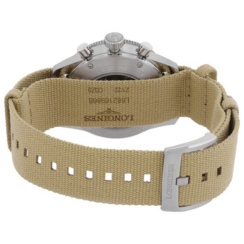 Silver-tone stainless steel case with a beige synthetic band. Bi-directional rotating silver-tone stainless steel bezel with a black ceramic ring. Sunray black dial with PVD bronze hands and Arabic numeral hour markers. Minute markers around the outer rim. Dial Type: Analog. Luminescent hands and markers. Chronograph - two sub-dials displaying: 60 second and 30 minute. Longines Calibre L791 automatic movement with a 68-hour power reserve. Scratch resistant sapphire crystal. Screw down crown. Transparent case back. Round case shape, case size: 42 mm, case thickness: 17 mm. Band width: 22 mm. Buckle clasp. Water resistant at 100 meters / 330 feet. Functions: chronograph, hour, minute, second. Longines Spirit Flyback Series. Sport watch style. Watch label: Swiss Made. Longines Spirit Flyback Chronograph Automatic Black Men's Watch L3.821.4.53.9.
