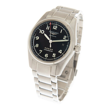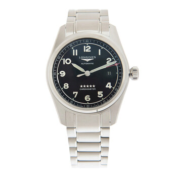 Stainless steel case with a stainless steel bracelet. Fixed stainless steel bezel. Black dial with luminous silver-tone hands and Arabic numeral hour markers. Arabic numeral minute markers (at 5 minute intervals). Minute markers around the outer rim. Dial Type: Analog. Luminescent hands and markers. Date display at the 3 o'clock position. Longines calibre L888.4 Automatic movement, based upon ETA A31.L11, containing 21 Jewels, bitting at 25200 vph, and has a power reserve of approximately 64 hours. Scratch resistant sapphire crystal. Solid case back. Round case shape. Case size: 40 mm. Band width: 21 mm. Deployment clasp with a push button release. Water resistant at 100 meters / 330 feet. Functions: hour, minute, second. Spirit Series. Luxury watch style. Watch label: Swiss Made. Longines Spirit Prestige Edition Automatic Black Dial Men's Watch L3.810.4.53.9.