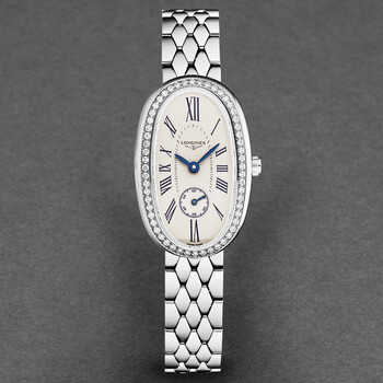Silver-tone stainless steel case with a silver-tone stainless steel bracelet. Fixed diamond set bezel. Silver-tone dial with blue hands and diamond hour markers. Dial Type: Analog. One - small second subdial. Longines Calibre L176 quartz movement. Scratch resistant sapphire crystal. Solid case back. Case size: 21.90 mm x 34.00 mm. Oval case shape. Band width: 11 mm. Deployment clasp. Water resistant at 30 meters / 100 feet. Functions: hour, minute, small second. Dress watch style. Watch label: Swiss Made. Item Variations: L2.306.0.71.6. Longines Symphonette Diamond Ladies Watch L2.306.0.71.6.