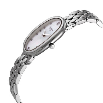 Stainless steel case with a stainless steel bracelet. Fixed stainless steel bezel. White mother of pearl dial with silver-tone hands and Wesselton vs diamond (0.037 carats) hour markers. Dial Type: Analog. Longines calibre L963 quartz movement. Scratch resistant sapphire crystal. Pull / push crown. Solid case back. Oval case shape. Case dimensions: 18.9 mm x 29.4 mm. Case thickness: 5.85 mm. Band width: 9 mm. Hidden fold over clasp. Water resistant at 30 meters / 100 feet. Functions: hour, minute. Symphonette Series. Dress watch style. Watch label: Swiss Made. Longines Symphonette Diamond White Mother of Pearl Dial Ladies Watch L2.305.4.87.6.