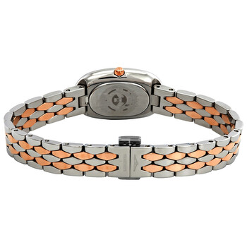 Silver-tone stainless steel case with a stainless steel and 18k pink gold bracelet. White mother of pearl dial with rose gold-tone hands and diamond hour markers. Dial Type: Analog. Longines Calibre L963 quartz movement. Scratch resistant sapphire crystal. Pull / push crown. Solid case back. Oval case shape. Case size: 18.90 x 29.40 mm. Fold over with safety release clasp. Water resistant at 30 meters / 100 feet. Functions: hour, minute. Additional Info: case set with 56 top wesselton if-vvs diamonds (0.280 carats), dial set with 13 top wesselton vs-si diamonds (0.037 carats). Dress watch style. Watch label: Swiss Made. Longines Symphonette Mother of Pearl Diamond Dial Ladies Steel and 18k Pink Gold Watch L2.305.5.89.7.