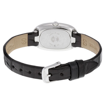 Silver-tone stainless steel case with a black leather strap. Fixed silver-tone stainless steel set with 56 diamonds bezel. Silver dial with blue hands and Roman numeral hour markers. Minute markers around an inner ring. Dial Type: Analog. Longines Calibre L963 quartz movement. Scratch resistant sapphire crystal. Pull / push crown. Solid case back. Oval case shape, case size: 29.4 mm x 18.9 mm, case thickness: 5.85 mm. Band width: 15 mm, band length: 7 inches. Tang clasp. Water resistant at 30 meters / 100 feet. Functions: hour, minute. Dress watch style. Watch label: Swiss Made. Item Variations: L23050710. Longines Symphonette Quartz Diamond Silver Dial Ladies Watch L2.305.0.71.0.