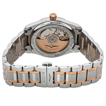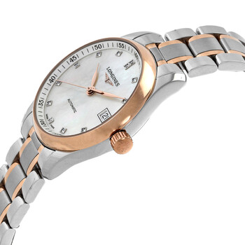 Silver-tone stainless steel case with a stainless steel and 18kt rose gold bracelet. Fixed 18kt rose gold bezel. White mother of pearl dial with rose gold-tone hands and diamond hour markers. Arabic numeral minute markers (at 5 minute intervals). Dial Type: Analog. Date display at the 3 o'clock position. Longines Calibre L888 Automatic movement, based upon ETA A31.L11, containing 21 Jewels, bitting at 25200 vph, and has a power reserve of approximately 64 hours. Scratch resistant sapphire crystal. Transparent case back. Round case shape, case size: 34 mm, case thickness: 9.2 mm. Band width: 18 mm. Fold over clasp with a safety release. Water resistant at 30 meters / 100 feet. Functions: date, hour, minute, second. Additional Info: dial set with 12 top wesselton vs-si diamonds, for a total of 0.055 carats. The Longines Master Collection Series. Dress watch style. Watch label: Swiss Made. Longines The Longines Master Collection Automatic Diamond White Mother of Pearl Dial Ladies Watch L2.357.5.89.7.