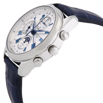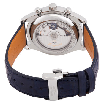 Silver-tone stainless steel case with a blue alligator leather strap. Fixed silver-tone stainless steel bezel. Silver dial with blue hands and Roman numeral hour markers. Date scale around the outer rim. Dial Type: Analog. Day and month display below the 12 o'clock positions. Three sub-dials displaying: small second/24 hour, moonphase/12 hour, 30 minute. Longines Calibre L687 Automatic movement, based upon ETA 7751, containing 25 Jewels, bitting at 28800 vph, and has a power reserve of approximately 54 hours. Scratch resistant sapphire crystal. Pull / push crown. Transparent case back. Round case shape, case size: 42 mm, case thickness: 14.2 mm. Band width: 21 mm. Folding buckle clasp. Water resistant at 30 meters / 100 feet. Functions: moon phase, chronograph, column wheel, month, date, day, GMT, second time zone, hour, minute, small second. The Longines Master Collection Series. Sport watch style. Watch label: Swiss Made. Longines The Longines Master Collection Chronograph GMT Automatic Moon Phase Silver Dial Men's Watch L2.773.4.71.2.