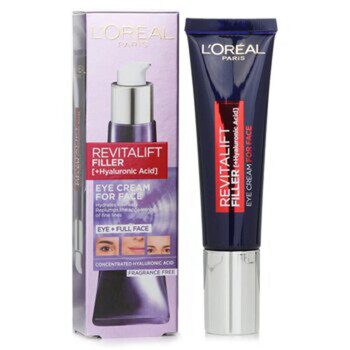 An intensely hydrating cream for the face & eyes. Features a lightweight, fast-absorbing texture. Contains 5 times high concentration of Hyaluronic Acid & 10 patented technology plus multiplier. Helps intensely hydrate skin while re-plumping fine lines. Blended with potent Pro-Xylane PRO to prevent first signs of aging. Skin appears smoother & dewier. Fragrance-free. Design house: L'Oreal. Gender: Ladies. Category: Skin Care. Type: Revitalift Filler Eye Cream For Face With Hyaluronic Acid. SubType: Moisturizers. Beauty group: Face. Size: 1 oz. Barcode: 3600523954940. L'Oreal Ladies Revitalift Filler Eye Cream For Face With Hyaluronic Acid 1 oz Skin Care 3600523954940.