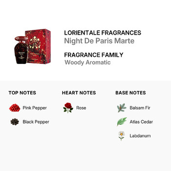 At first spray, Night De Paris Marte awakens your senses with the spicy sparkle of pink pepper and black pepper, creating an energetic and confident opening. As the heart unfolds, a delicate rose blooms, adding a layer of smooth romance and warmth. Finally, the base grounds the fragrance in earthy richness with balsam fir, Atlas cedar, and labdanum — delivering a bold, woody finish that lingers beautifully on the skin.