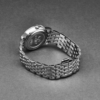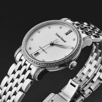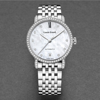 Silver-tone stainless steel case and bracelet. Fixed silver-tone stainless steel bezel. White dial with silver-tone hands and diamond hour markers. Dial Type: Analog. Date display at the 6 o'clock position. Automatic movement. Scratch resistant sapphire crystal. Pull / push crown. Solid case back. Round case shape, case size: 33 mm, case thickness: 8.5 mm. Band width: 17 mm, band length: 7 inches. Deployment with push button release clasp. Water resistant at 30 meters / 100 feet. Functions: date, hour, minute, second. Additional Info: hours, minutes, seconds, date. Excellence Series. Luxury watch style. Watch label: Swiss Made. Louis Erard Excellence Automatic Diamond White Dial Ladies Watch 68235FS14.BMA34.