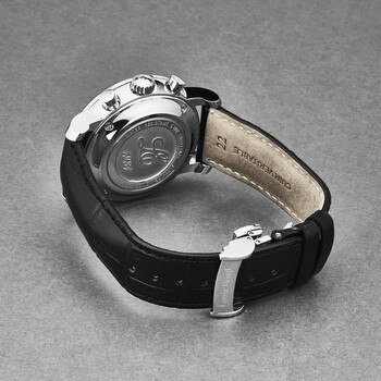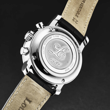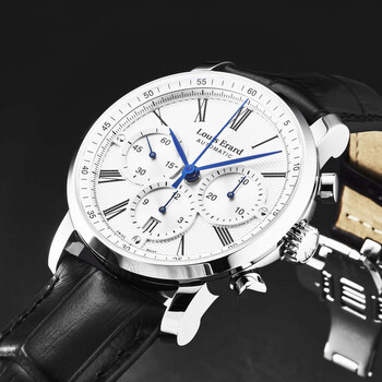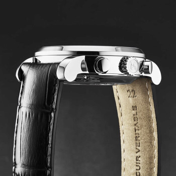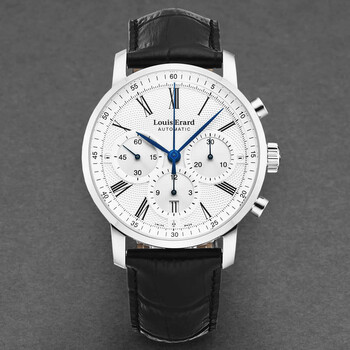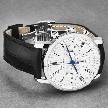 Silver-tone stainless steel case with a black leather strap. Fixed silver-tone stainless steel bezel. Silver-tone dial with blue hands and Roman numeral hour markers. Minute markers around the outer rim. Dial Type: Analog. Chronograph - three sub-dials displaying: 60 second, 30 minute and 12 hour. Automatic movement. Scratch resistant sapphire crystal. Pull / push crown. Solid case back. Round case shape, case size: 42 mm, case thickness: 14 mm. Band width: 22 mm, band length: 8 inches. Deployment with push button release clasp. Water resistant at 50 meters / 165 feet. Functions: chronograph, hour, minute, second. Excellence Series. Luxury watch style. Watch label: Swiss Made. Louis Erard Excellence Chronograph Automatic Silver Dial Men's Watch 71231AA31.BDC51.