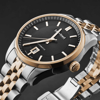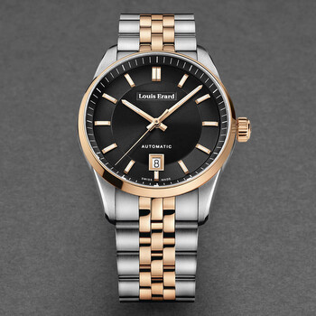 Silver-tone stainless steel case with a two-tone (silver-tone and rose gold-tone) stainless steel bracelet. Fixed rose gold-tone stainless steel bezel. Black dial with rose gold-tone hands and index hour markers. Minute markers around the outer rim. Dial Type: Analog. Luminescent hands and markers. Date display at the 6 o'clock position. Automatic movement. Scratch resistant sapphire crystal. Pull / push crown. Solid case back. Round case shape, case size: 40 mm, case thickness: 11 mm. Band width: 20 mm, band length: 8 inches. Deployment with push button release clasp. Water resistant at 50 meters / 165 feet. Functions: date, hour, minute, second. Additional Info: hours, minutes, seconds, date. Heritage Series. Luxury watch style. Watch label: Swiss Made. Louis Erard Heritage Automatic Black Dial Men's Watch 69101AB72.BMA58.