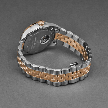 Silver-tone stainless steel case with a two-tone (silver-tone and rose gold-tone) stainless steel bracelet. Fixed rose gold-tone stainless steel bezel. Silver-tone dial with rose gold-tone hands and index hour markers. Minute markers around the outer rim. Dial Type: Analog. Luminescent hands and markers. Date display at the 6 o'clock position. Automatic movement. Scratch resistant sapphire crystal. Pull / push crown. Solid case back. Round case shape, case size: 40 mm, case thickness: 11 mm. Band width: 20 mm, band length: 8 inches. Deployment with push button release clasp. Water resistant at 50 meters / 165 feet. Functions: date, hour, minute, second. Additional Info: hours, minutes, seconds, date. Heritage Series. Luxury watch style. Louis Erard Heritage Automatic Silver Dial Men's Watch 69101AB71.BMA58.