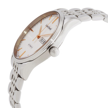 Stainless steel case with a stainless steel bracelet. Fixed stainless steel bezel. Silver-tone dial with rose gold-tone hands and index hour markers. Minute markers around the outer rim. Dial Type: Analog. Day of the week and date display at the 3 o'clock position. Automatic movement. Scratch resistant sapphire crystal. Pull / push crown. Transparent case back. Round case shape. Case size: 41 mm. Case thickness: 12 mm. Band width: 20 mm. Band length: 8 inches. Fold over clasp with a push button release. Water resistant at 50 meters / 165 feet. Functions: date, day, hour, minute, second. Heritage Series. Luxury watch style. Watch label: Swiss Made. Louis Erard Heritage Automatic Silver Dial Men's Watch 72288AA31.BMA88.