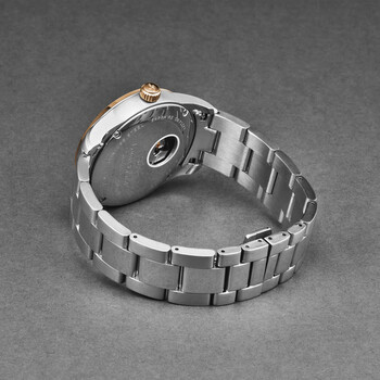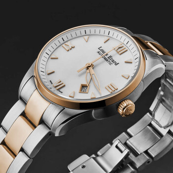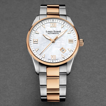 Silver-tone stainless steel case with a two-tone (silver-tone and rose gold-tone) stainless steel bracelet. Fixed rose gold-tone stainless steel bezel. White dial with rose gold-tone hands and Roman numeral & index hour markers. Minute markers around the outer rim. Dial Type: Analog. Luminescent hands and markers. Date display between 4 and 5 o'clock position. Automatic movement. Scratch resistant sapphire crystal. Pull / push crown. Solid case back. Round case shape, case size: 40 mm, case thickness: 11 mm. Band width: 20 mm, band length: 8 inches. Deployment with push button release clasp. Water resistant at 50 meters / 165 feet. Functions: date, hour, minute, second. Additional Info: hours, minutes, seconds, date. Heritage Series. Luxury watch style. Watch label: Swiss Made. Louis Erard Heritage Automatic White Dial Men's Watch 69101AB24.BMA21.