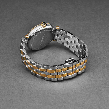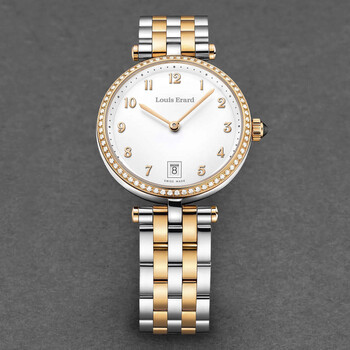 Stainless steel case with a two-tone (silver-tone and rose gold-tone) stainless steel bracelet. Fixed rose gold-tone stainless steel bezel. White dial with rose gold-tone hands and Arabic numeral hour markers. Dial Type: Analog. Date display at the 6 o'clock position. Quartz movement. Scratch resistant sapphire crystal. Pull / push crown. Solid case back. Round case shape, case size: 33 mm, case thickness: 8.6 mm. Band width: 16 mm, band length: 7 inches. Deployment with push button release clasp. Water resistant at 50 meters / 165 feet. Functions: date, hour, minute. Additional Info: hours, minutes, date. Romance Series. Luxury watch style. Watch label: Swiss Made. Louis Erard Romance Quartz White Dial Ladies Watch 11810SB40.BMA27.