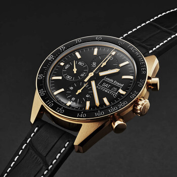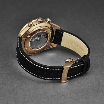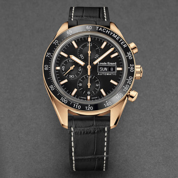 Rose gold-tone stainless steel case with a black leather strap. Fixed black stainless steel bezel. Black dial with rose gold-tone hands and index hour markers. Minute markers around the outer rim. Dial Type: Analog. Luminescent hands and markers. Day of the week and date display at the 3 o'clock position. Chronograph - three sub-dials displaying: 60 second, 30 minute and 12 hour. Automatic movement. Scratch resistant sapphire crystal. Pull / push crown. Transparent case back. Round case shape, case size: 44 mm, case thickness: 15 mm. Band width: 20 mm, band length: 8 inches. Deployment with push button release clasp. Water resistant at 50 meters / 165 feet. Functions: chronograph, day, date, hour, minute, second. Additional Info: hours, minutes, small seconds, day-date, chronograph. Sportive Series. Luxury watch style. Watch label: Swiss Made. Louis Erard Sportive Chronograph Automatic Black Dial Men's Watch 78109PR12.BDCR152.